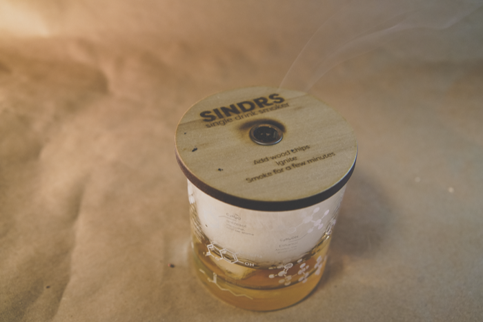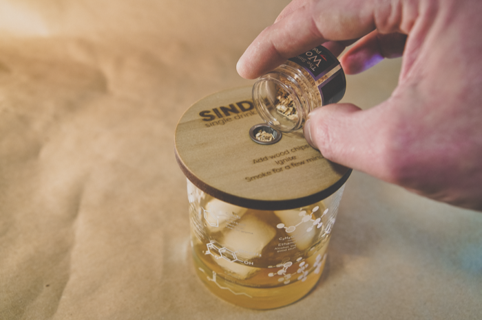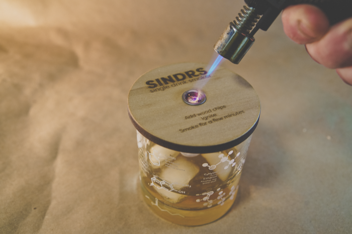 Sindrs, short for SINgle DRink Smoker...clever, right?...was designed to make smoking individual cocktails super easy and fun. All you need to do is add the provided wood chips (or your own) to the metal filter and ignite.